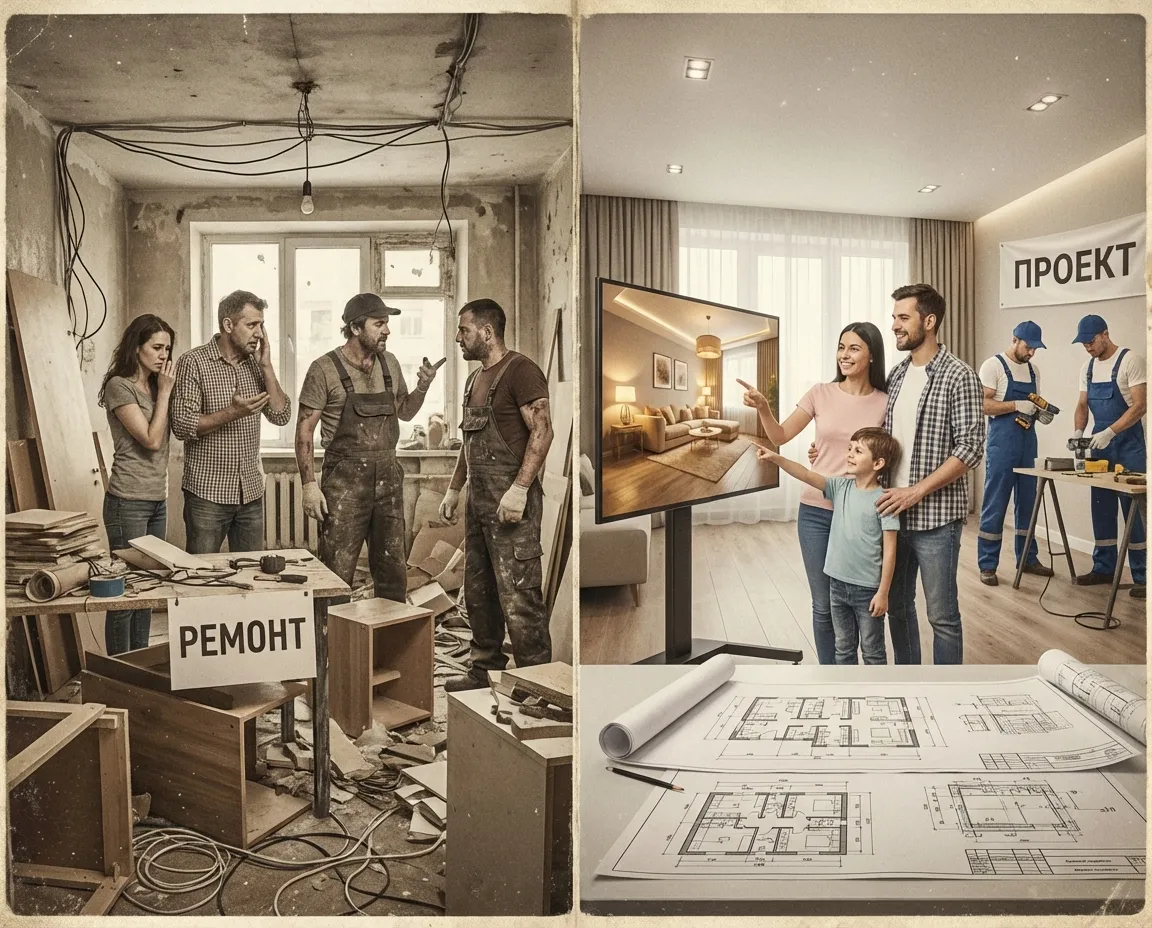 Первая семья решила действовать по старинке: самостоятельно разбираться в материалах, спорить о цветах, менять планы на ходу и немного полагаться на авось. Итог предсказуем: ремонт растянулся на долгие месяцы, настроение падало, результат оставлял желать лучшего, а мечты о гармонии растворялись в бесконечных переделках.